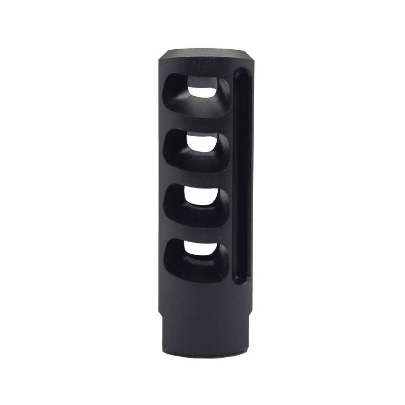 Frein de bouche destiné aux chasseurs et tireurs utilisant des armes de gros calibres avec un recul important, et dont les préoccupations premières sont la réduction importante du recul et la diminution de l'élévation du canon lors du tir.